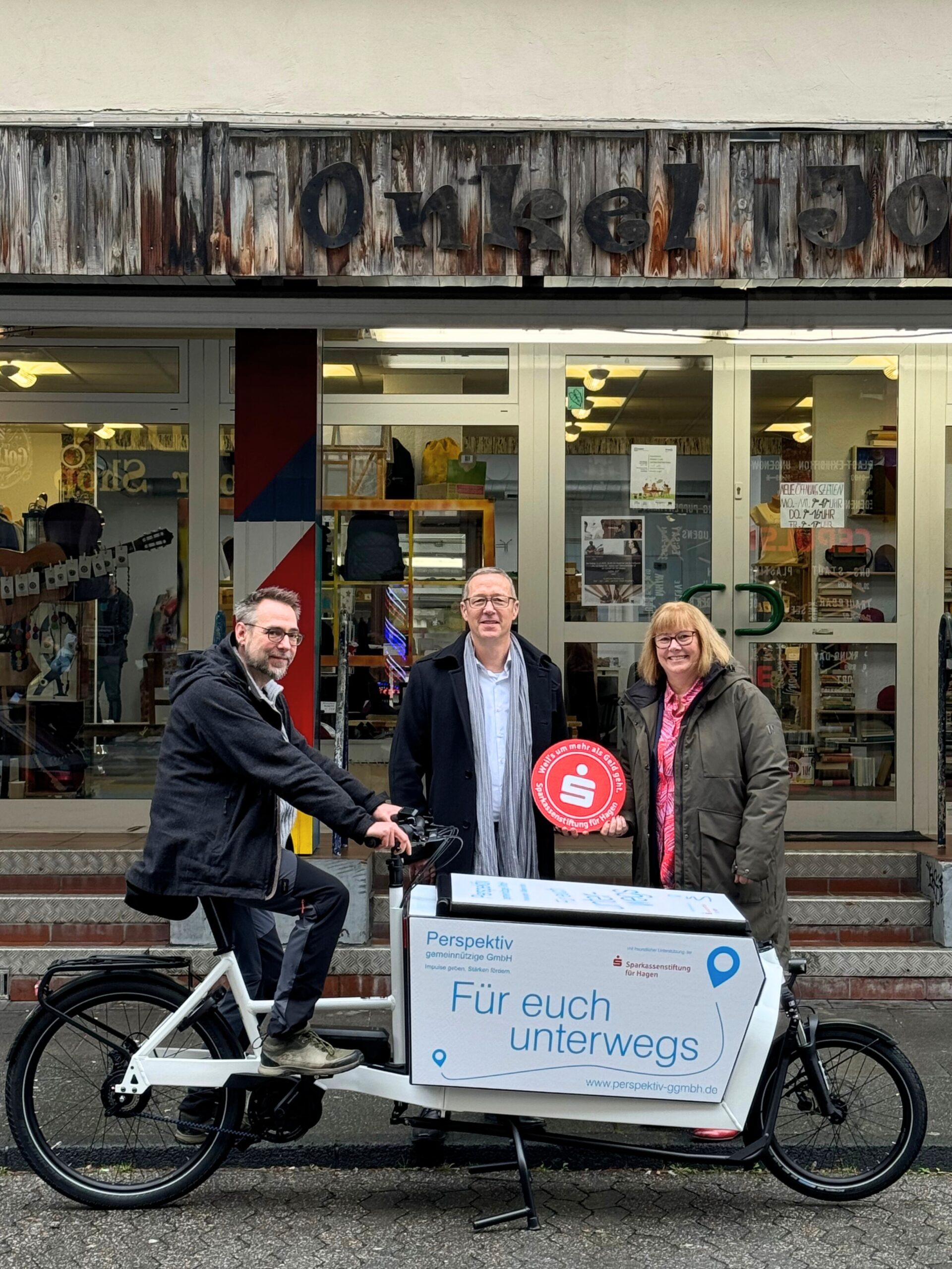 Hagen. Die Perspektiv gemeinnützige GmbH hat ein neues, professionell foliertes E-Lastenfahrrad erhalten. Das Fahrzeug wurde in der Lange Straße 24 – bekannt als „Onkel Jo sein Laden“ – offiziell übergeben. Ermöglicht wurde die Anschaffung durch die finanzielle Unterstützung der Sparkassenstiftung für Hagen. Das E-Lastenfahrrad stammt von e-motion Herdecke und wurde vom ideenpool-Team aus Hagen im Corporate Design der neu gegründeten Perspektiv gem. GmbH gestaltet. Zur Übergabe vor Ort war Thorsten Irmer, Stiftungsvorstand der Sparkassenstiftung für Hagen, anwesend. Entgegengenommen wurde das Rad von Annette Jeschak, Geschäftsführerin der Perspektiv gem. GmbH. Thorsten Irmer: „Wir freuen uns sehr, dass die unsere Stiftung hier einen Beitrag leisten konnte. Das Lastenfahrrad hilft, die Angebote der Perspektiv gGmbH noch niedrigschwelliger anzubieten. So erreicht man deutlich mehr Jugendliche und junge Erwachsene, die eventuell Unterstützung auf ihrem Weg ins Berufsleben benötigen.“